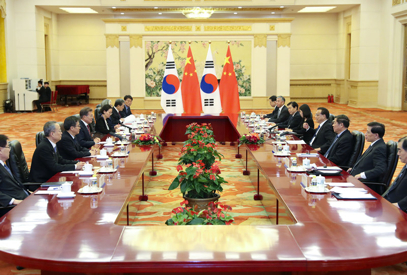 国务院总理李克强12月15日下午在人民大会堂会见来华进行国事访问的韩国总统文在寅。