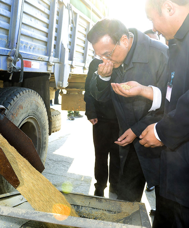 图为2013年11月4日,李克强总理来到黑龙江抚远考察粮食收储情况。